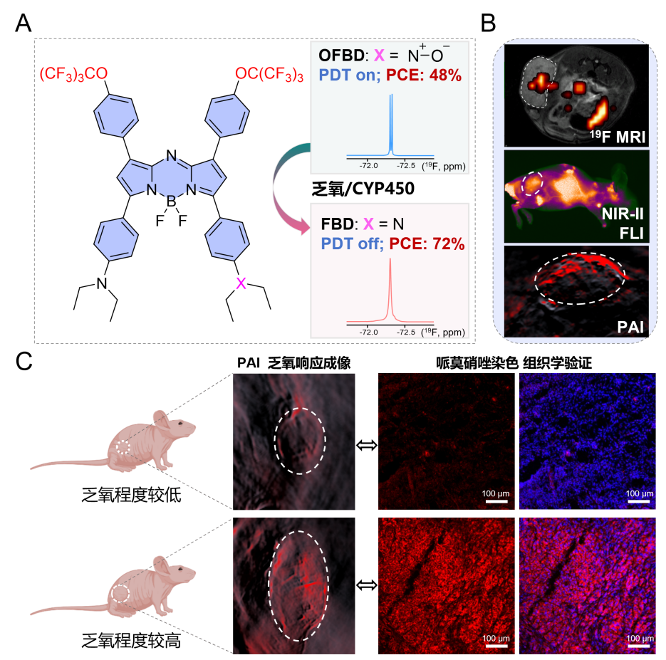 近期,evo视讯官网研究团队在多模态成像领域取得新进展。研究团队顺利获得对光敏分子aza-BODIPY进行氟化改造,并结合氟相共组装策略,构建了一种乏氧响应型多模态成像体系,实现了氟-19磁共振成像(19F MRI)、近红外二区荧光成像(NIR-II FLI)和光声成像(PAI)的协同应用,为深部肿瘤的精准成像给予了新的解决方案。相关研究成果发表在《先进科学》(Advanced Science)上。